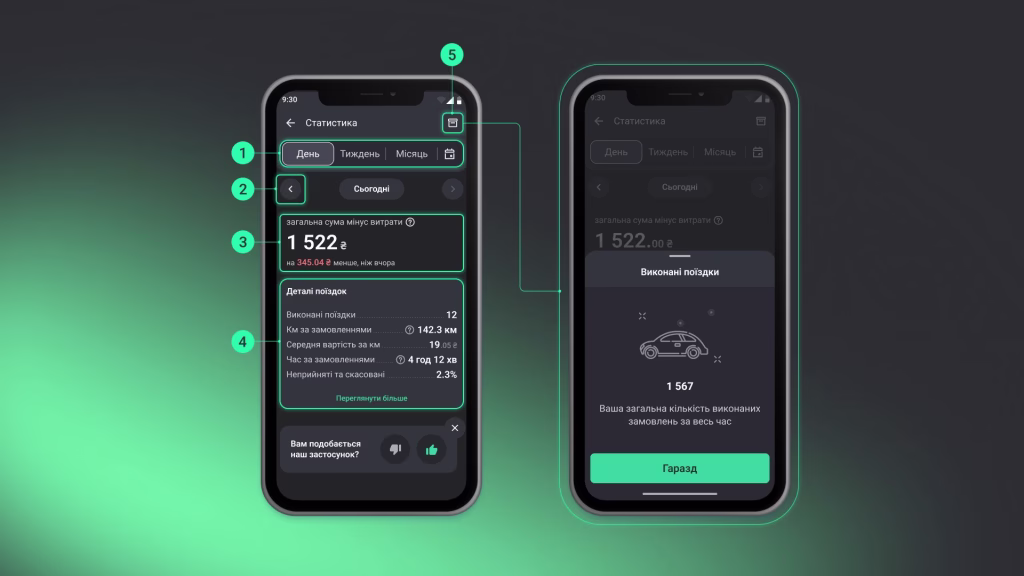 Також ви побачите блок із деталями поїздок (див. зображення нижче – п.4): кількість, відстань у км, середню вартість та час у дорозі та відсоток скасованих поїздок.