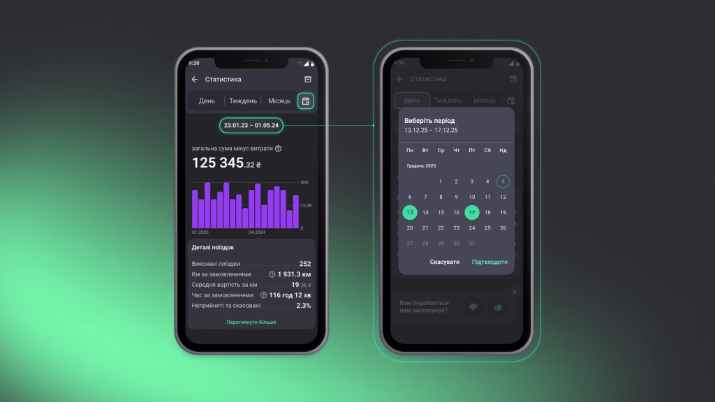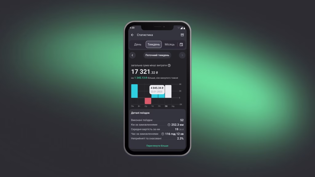 Статистика — зручний інструмент для водія, щоб відстежувати свою ефективність: спостерігати за надходженнями та витратами в межах обраного періоду.