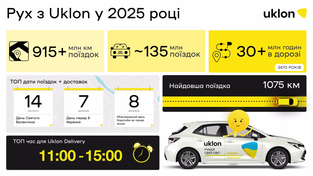 Uklon підсумував рік роботи сервісів райдхейлінгу та доставки в Україні. Компанія поділилася ключовою статистикою про те, як рухалися українці з Uklon: куди найчастіше їздили, коли та звідки замовляли доставку та які рекорди встановили міста та користувачі у 2025 році.